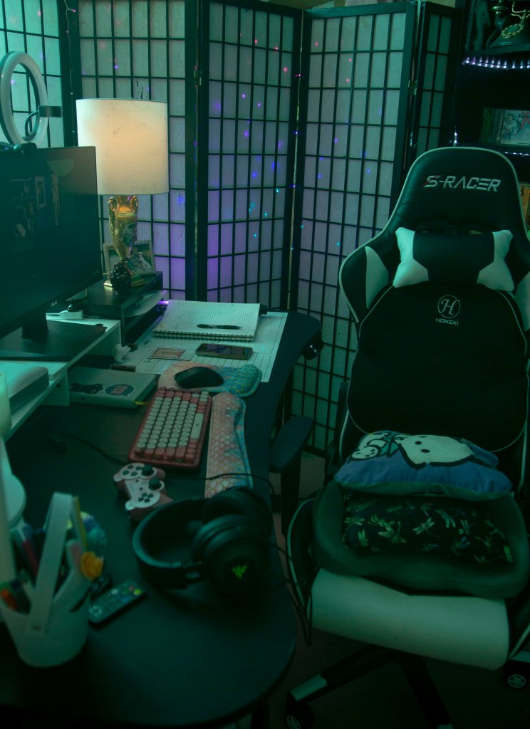 Now that I’m lucky enough to work from home, I’m passionate about my workspace. It needs to be colorful, inviting, well-lit. Since I stream, it also needs to look good on camera (and I need to think critically about where I sit and how the camera is angled as well.) My new space has a dedicated home for my ring light and phone stand as well, which is a dream come true.